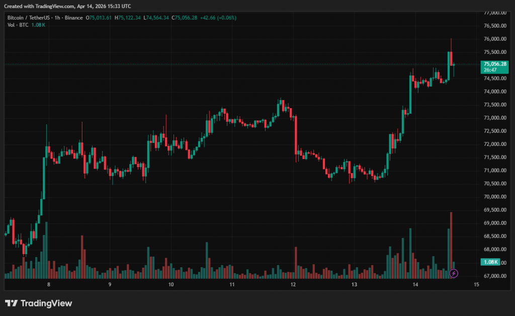 На момент написання перша криптовалюта торгується близько $75 200 — максимум із початку лютого. За останню добу котирування монети підскочили на 4,5%.