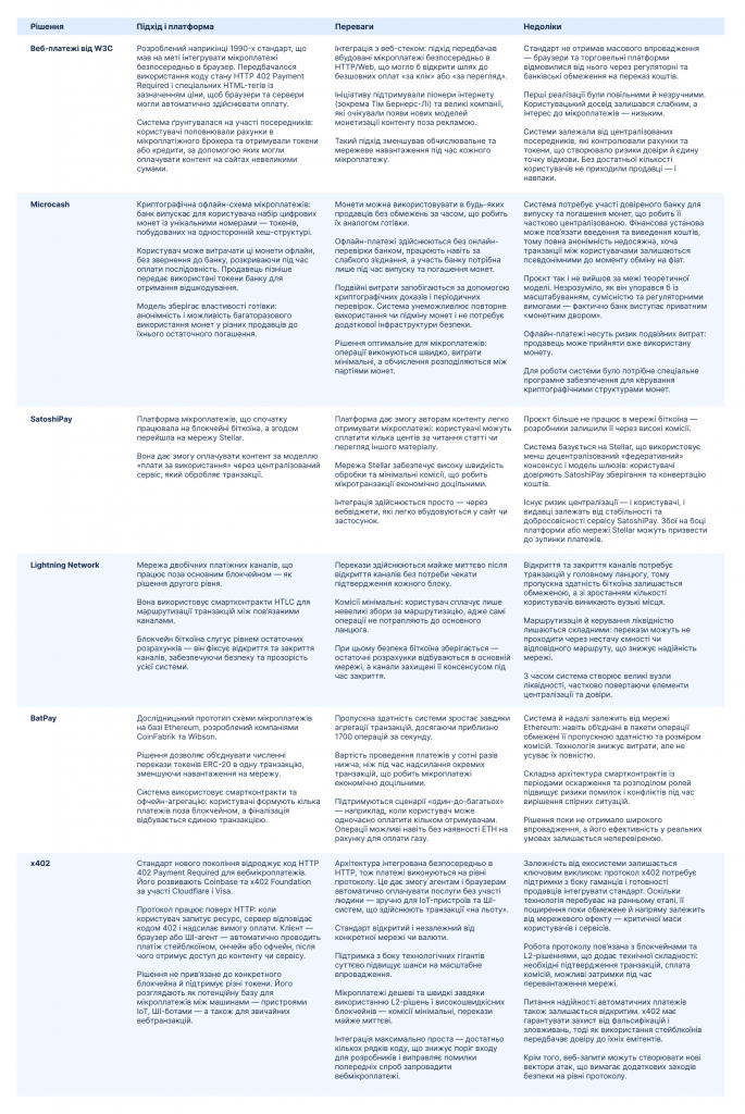 Нижче наведено порівняння описаних вище систем мікроплатежів: ранніх стандартів W3C для веб-мікроплатежів, схеми Microcash, SatoshiPay, LN, BatPay і сучасного протоколу x402. Кожна з них пропонує власний підхід.