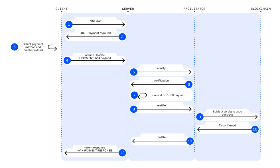 Представлений Coinbase у травні 2025 року відкритий платіжний стандарт x402 забезпечує миттєві автоматичні платежі в стейблкоїнах прямо по HTTP.