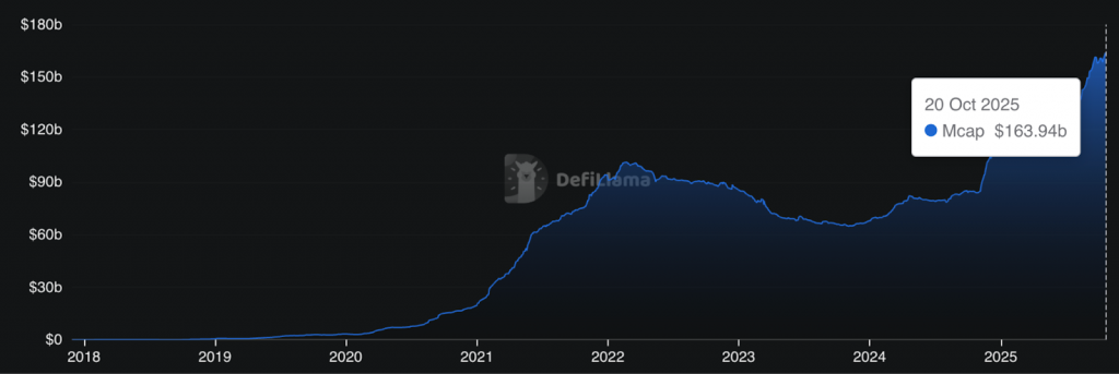 1. Обсяг стейблкоїнів (Stablecoin Supply) мережі оновив історичний максимум у $164 млрд та залишається найвищим серед блокчейнів.