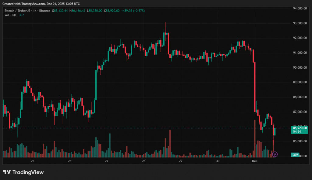 У ніч на 1 грудня котирування біткоїна опустилися нижче $85 500 після відновлення до $91 000. На момент підготовки актив торгується близько $86 000.