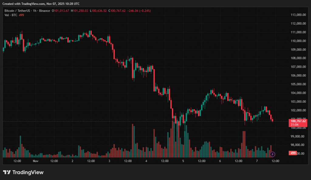 Станом на момент написання біткоїн торгується по ~$100 800. За останню добу його ціна знизилася на 2%.