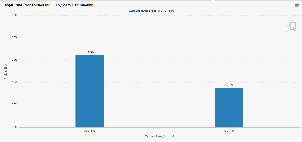 Станом на момент написання учасники ринку оцінюють імовірність подальшого пом’якшення монетарної політики ФРС майже у 65%.