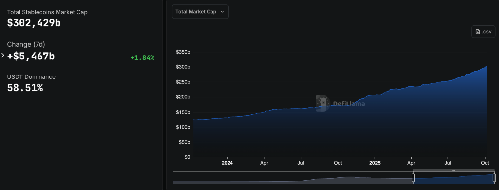 29 вересня капіталізація сегмента стейблкоїнів вперше перевищила $300 млрд. На момент написання вона становить $302,4 млрд. Лише за останній квартал пропозиція цих активів зросла на рекордні $45 млрд.