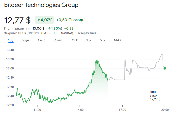 На момент написання акції Bitdeer зросли на 4,07% — до $12,77.