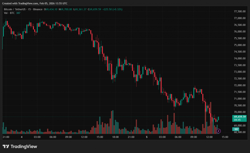У моменті ціна опускалася до $69 185. Просідання від жовтневого максимуму становить близько 45%.
