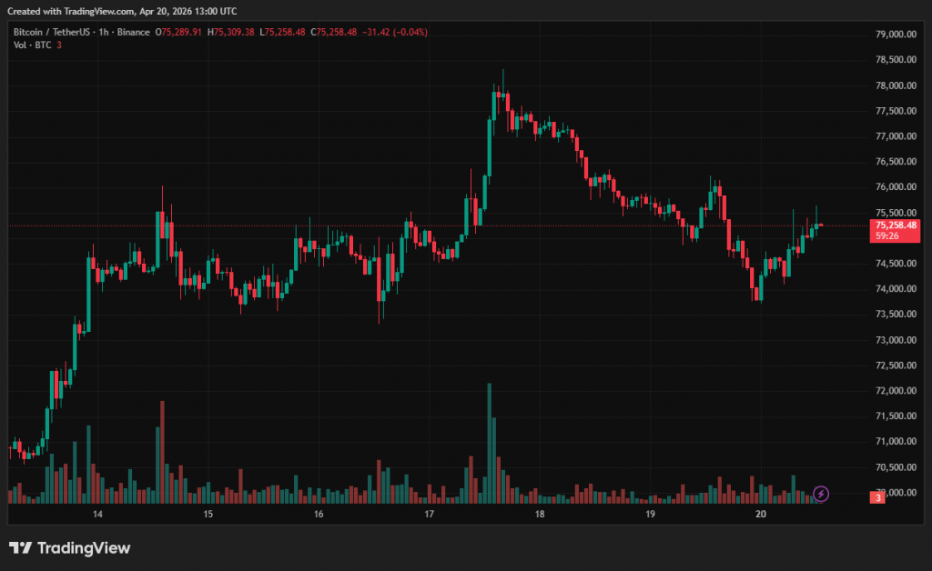 20 квітня курс біткоїна тримається біля $75 000: −0,2% за добу, але +6,3% за тиждень. На вихідних США захопили іранське судно, а Тегеран відновив контроль над Ормузькою протокою.