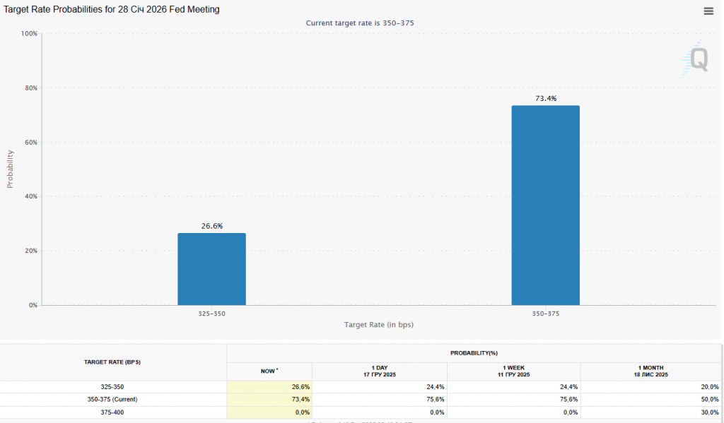Під час пресконференції голова Федрезерву Джером Пауелл дав зрозуміти, що регулятор може не знизити ставку в січні. Учасники ринку оцінюють імовірність збереження поточного діапазону (3,50–3,75%) у 73,4%.