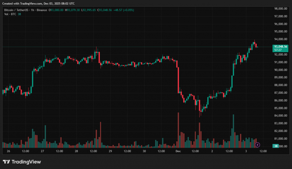 За останню добу ціна біткоїна зросла на 7,9% — до ~$93 800, відігравши втрати після різкого провалу до $84 500.