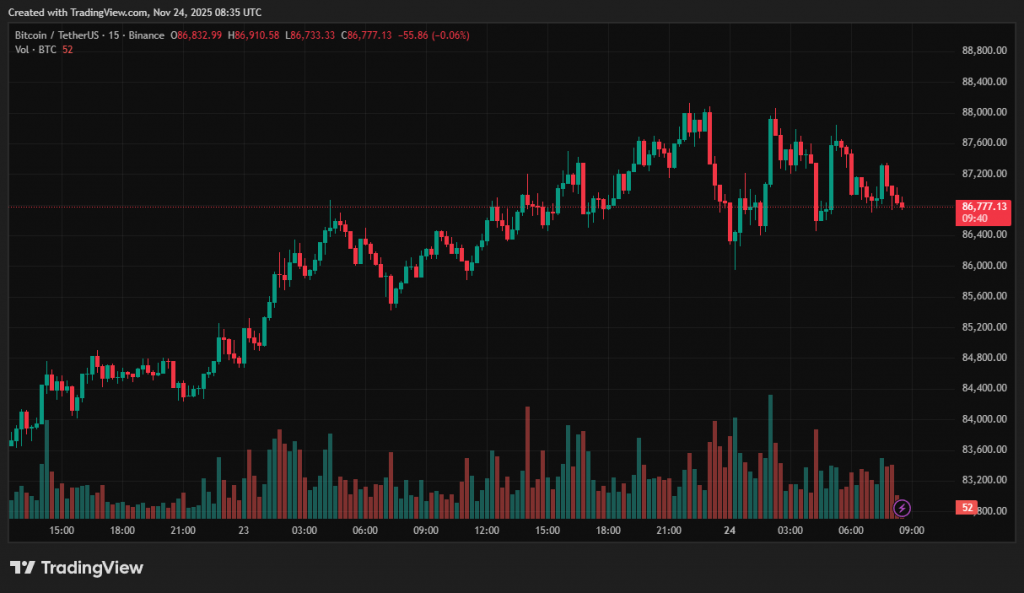 Біткоїн демонструє ознаки відновлення після хвилі ліквідацій і розпродажів. Ціна піднімалася до ~$87 900.