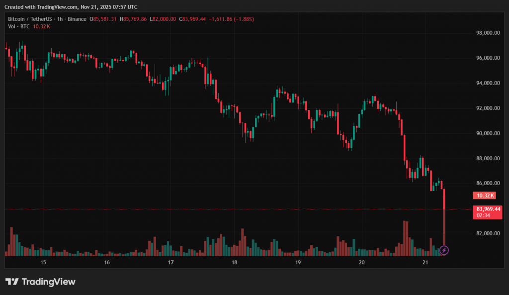 Протягом останньої доби біткоїн подешевшав більш ніж на 7%. В моменті ціна падала до ~$82 000 — мінімум з квітня.