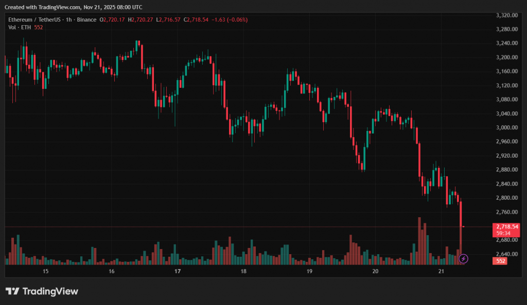 Листопад 2025 року може стати одним із найгірших для біткоїна. Від початку місяця актив подешевшав на 21,6%. Схожа динаміка у Ethereum, який за той самий період впав більш ніж на 27%.