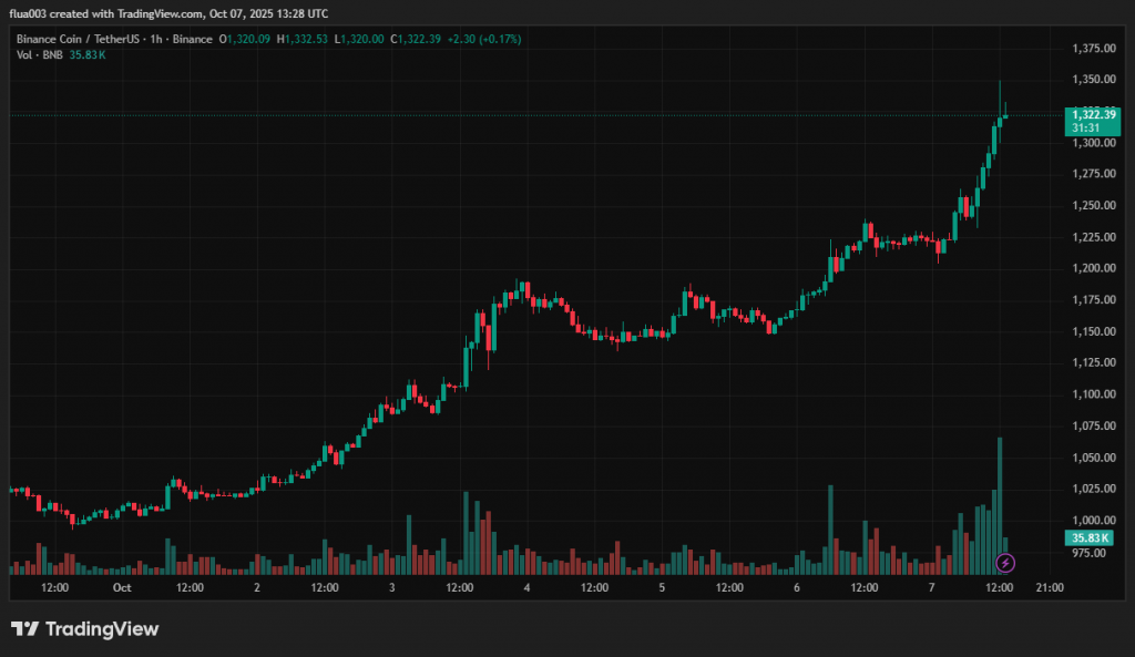 За останню добу курс монети зріс майже на 6%. 7 жовтня ціна BNB вперше перевищила $1300 і наразі становить $1320.