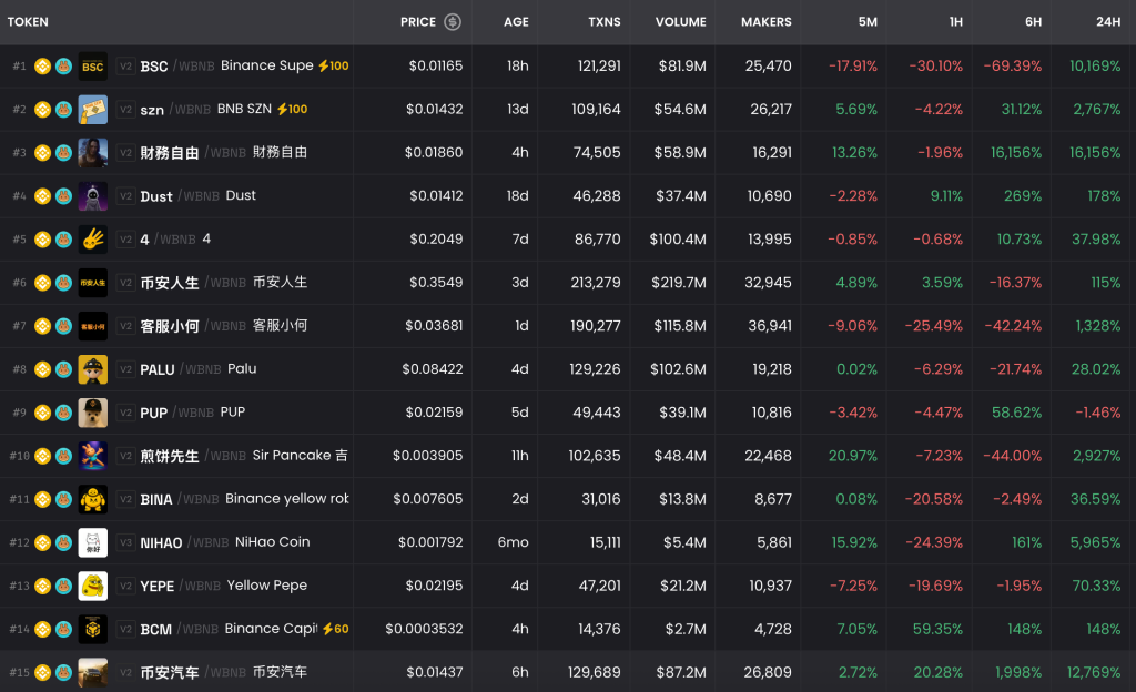 Наразі 19 із 20 трендових токенів на агрегаторі DEX Screener належать до екосистеми BNB Chain.