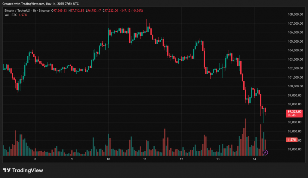 Лише за останню добу капіталізація крипторинку знизилася на 6,5% — до $3,3 трлн. Курс біткоїна пробив психологічно важливий рівень $100 000 і опустився до ~$97 000.