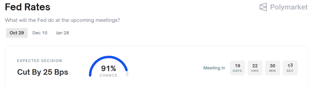 Трейдери на платформі Polymarket оцінюють у 91% імовірність зниження ставки на 25 базисних пунктів на засіданні 29 жовтня.