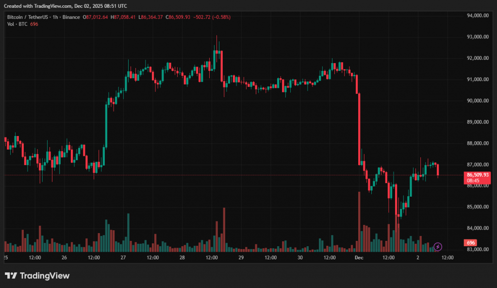 На момент написання перша криптовалюта торгується близько $86 900 — на 30,9% нижче історичного максимуму на рівні $126 080.