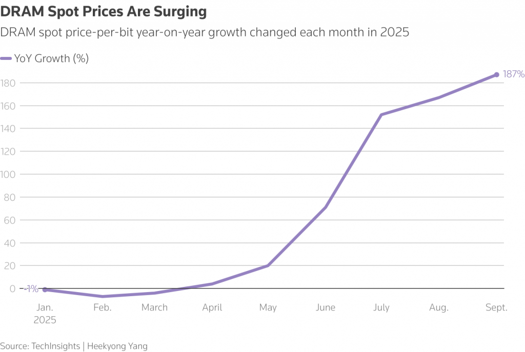 За даними TechInsights, спотові ціни на DRAM утричі зросли у вересні порівняно з минулим роком, тоді як у квітні збільшення становило лише 4%. Середній рівень запасів DRAM скоротився з 31 тижня на початку 2023 року до всього восьми у поточному кварталі.