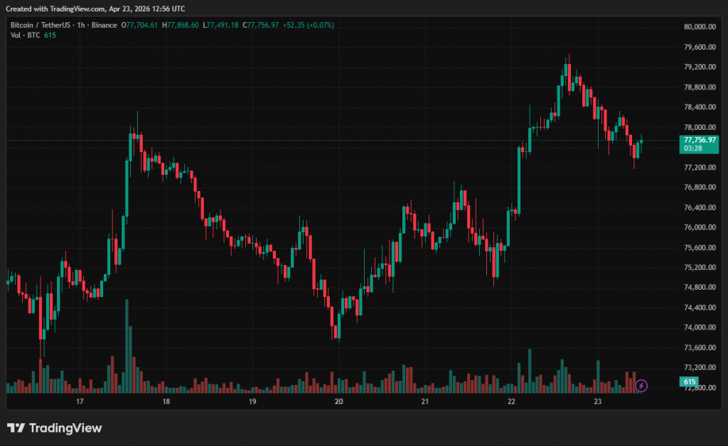 На момент написання перша криптовалюта торгується близько $77 700. За минулі 24 години курс активу знизився на 0,8%, але за тиждень додав 4,2%, досягнувши локального максимуму в районі $80 000.
