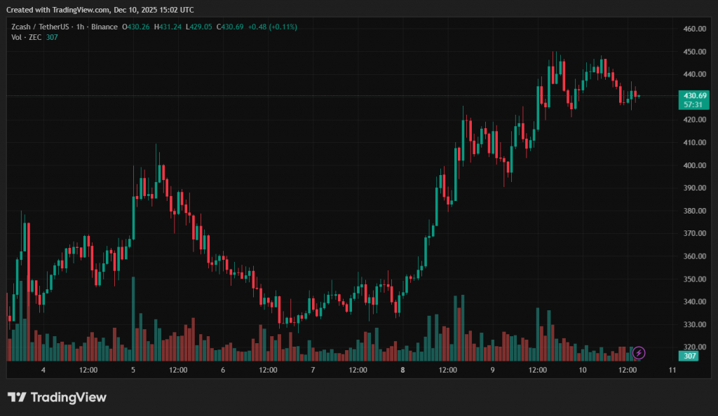 Ініціатива підштовхнула курс ZEC — ціна підскочила на 12%. На момент написання анонімна монета торгується по $433. За останній тиждень токен додав 25%.