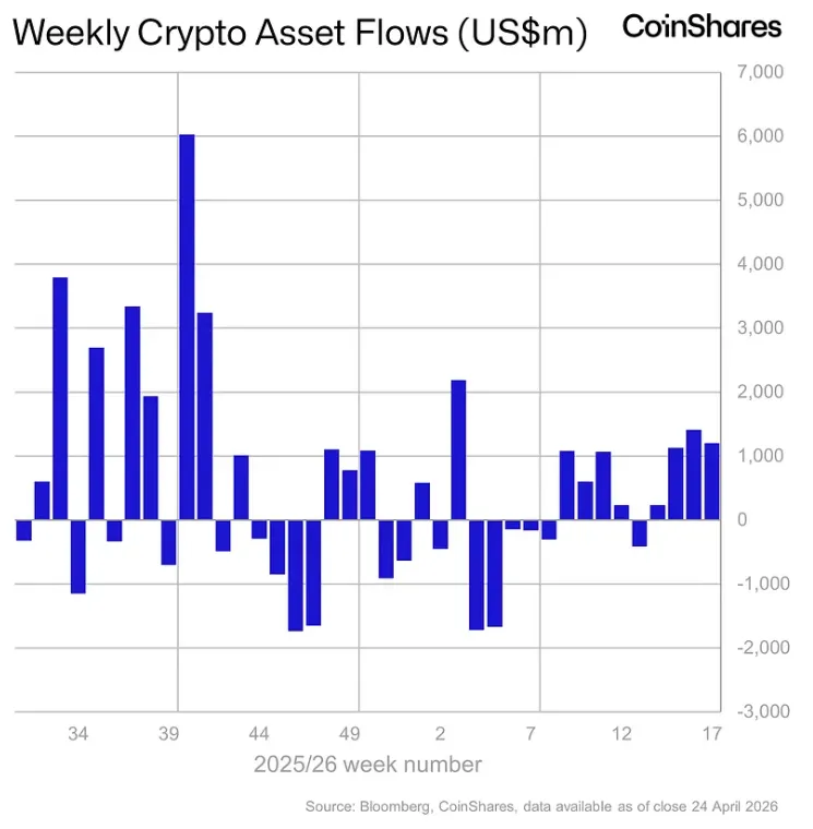З 20 по 24 квітня надходження до інвестиційних продуктів на базі цифрових активів становили $1,2 млрд. Позитивна динаміка триває четвертий тиждень поспіль, згідно зі звітом CoinShares.