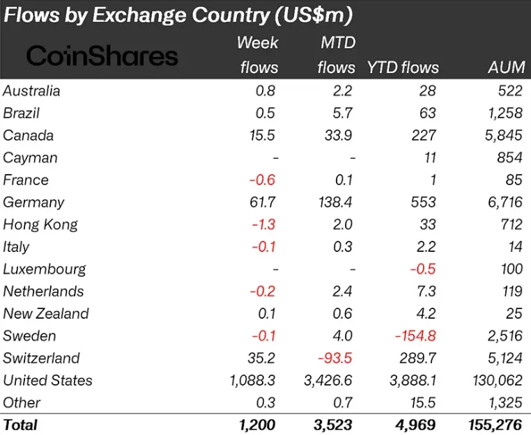 США зберегли лідерство за обсягом вкладень — $1,1 млрд. У Німеччині притік коштів подвоївся та склав $61,7 млн. Інвестфонди Швейцарії та Канади також зафіксували притоки — $35,2 млн і $15 млн відповідно.