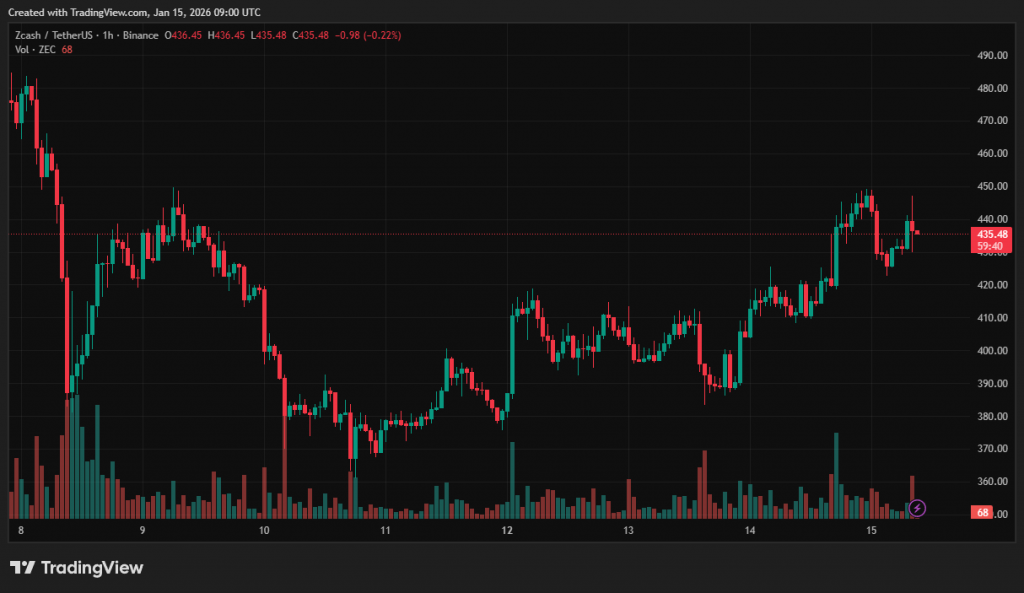 За останню добу ціна ZEC зросла на 3,7%. На момент написання актив торгується близько $435.