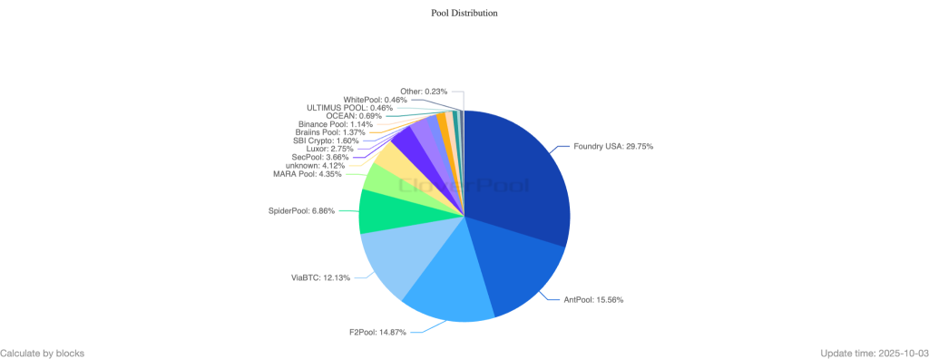 Серед пулів Foundry USA контролює 29,7% хешрейта, AntPool — 15,5%, F2Pool — 14,8%. Разом три структури забезпечують близько 60% потужностей.