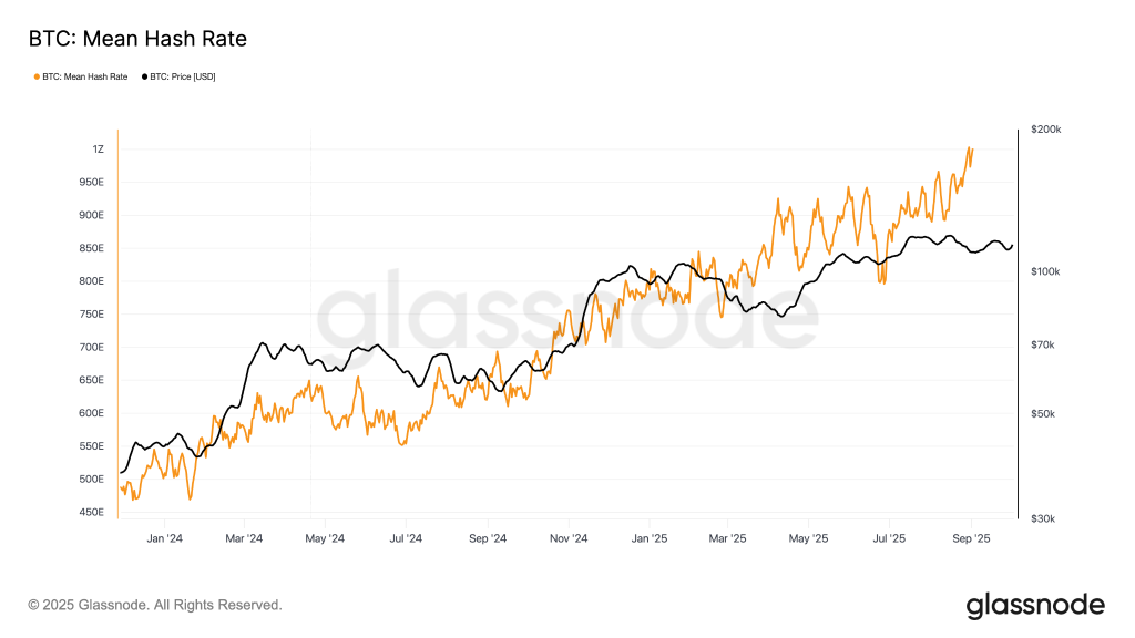 За даними Glassnode, хешрейт (7 DMA) стабільно перевищує 1 ZH/s.