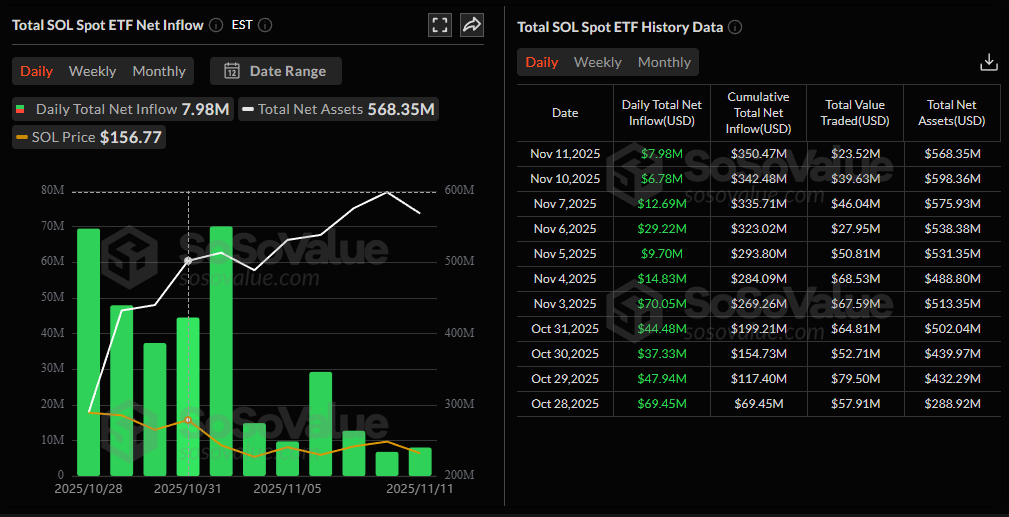 За підсумками останньої торгової сесії 11 листопада спотові ETF на базі Solana залучили $7,9 млн. Позитивна динаміка триває одинадцятий день поспіль.