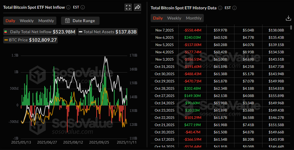 Інструменти на базі біткоїна залучили $523 млн, довівши загальні чисті притоки до $60,4 млрд.