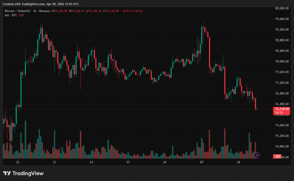 На момент написання «цифрове золото» торгується поблизу $76 600. За останню добу ціна активу знизилася на 1,6%.