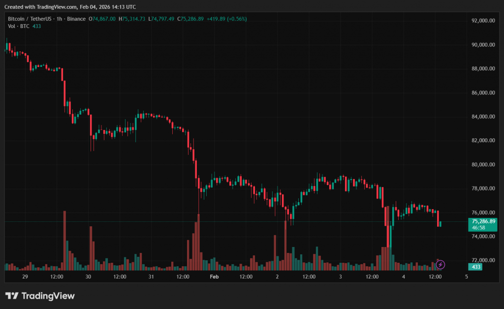 На момент написання біткоїн торгується близько $75 300, частково відновившись після просадки до $73 000.