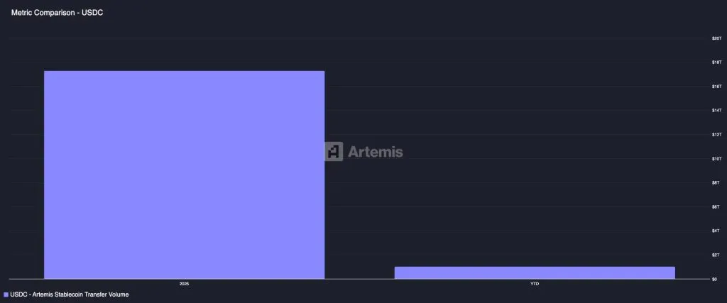 Обсяг переданої ончейн-вартості через стейблкоїн USDC від Circle за минулий рік становив $17,3 трлн, обійшовши USDT від Tether з показником $12,9 трлн. Про це свідчать дані аналітичної платформи Artemis.