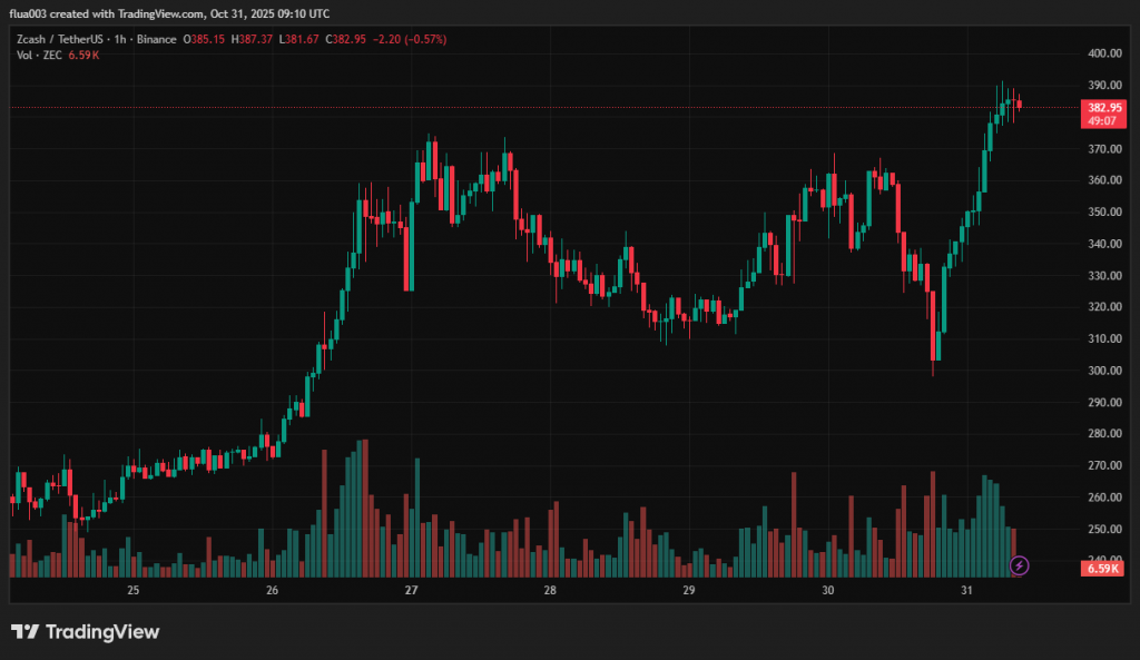 За останню добу ціна токена зросла на 7%, за тиждень — на 49%, а за місяць — більш ніж на 91%. На момент публікації Zcash торгується біля $382.