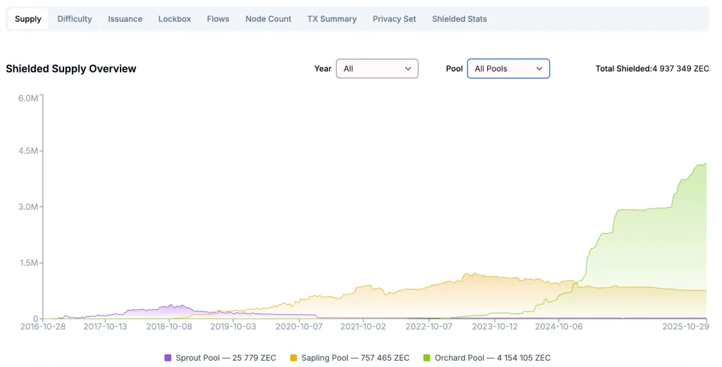 Кожна нова версія формувала власний захищений пул, зберігаючи сумісність із попередніми. Нині найбільшим є Orchard — у ньому зосереджено близько 4,1 млн ZEC.
