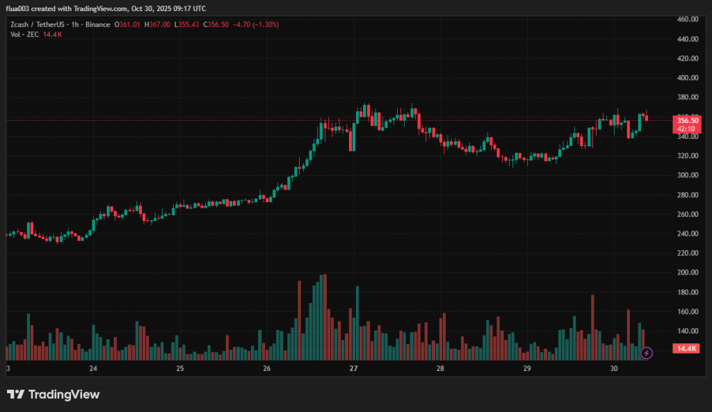 Тим часом курс Zcash продовжує зростати: за останню добу монета подорожчала на 8,6%, а за тиждень — на 46,4%, досягнувши $355.